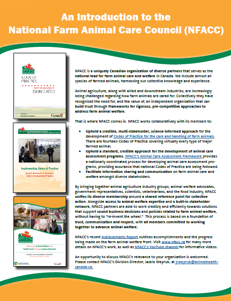 NFACC is a forum where all believe in progressive and achievable advances in animal welfare, coming together, and deliberating upon how to support the welfare of animals used in agriculture (via Codes of Practice and Animal Care Assessment Programs).